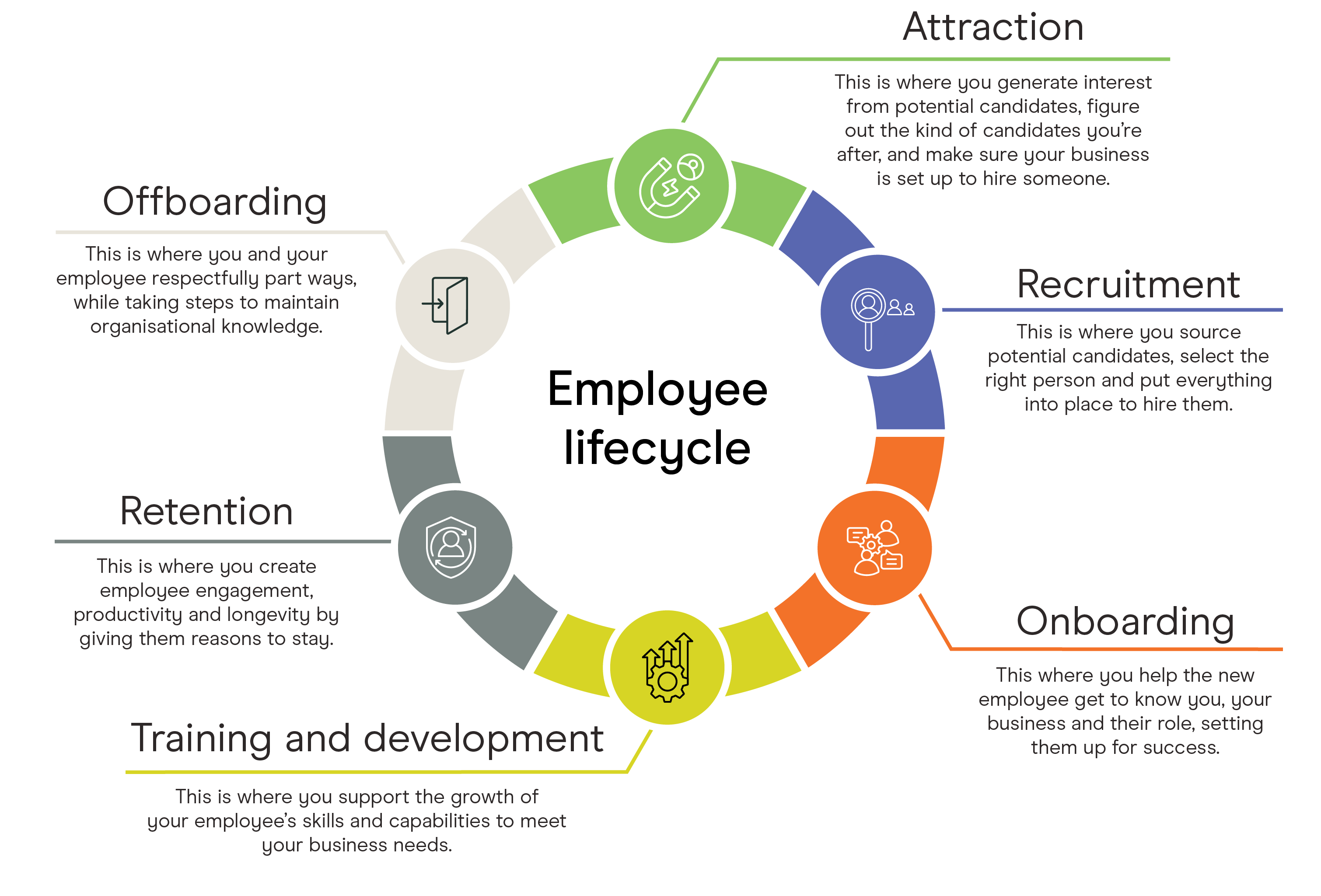 The employee lifecycle describes the journey an employee takes from awareness of your business to when they eventually leave.