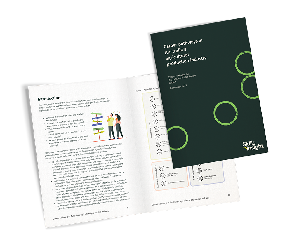 To support the growth of Australia’s agriculture industry, Skills Insight is investigating how to strengthen the attraction of agriculture careers by mapping pathways for cross-functional careers with qualifications in the Agriculture, Horticulture and Conservation and Land Management Training Package. This project is also key to identifying a potential agricultural trade qualification pathway.